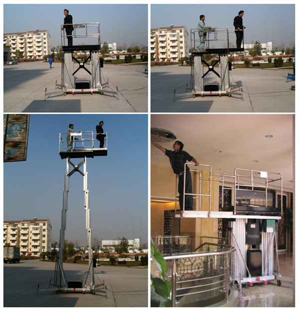 單柱鋁合金升降機:該系列產品為室內型,廣泛適用于星級酒店,大型超市等各行業大廳、廠房內的高空作業, 具有升降平衡,操作方便,能進入一般門廳,可隨意進出電梯且耗電少、工作時不傷 地面,可用于貼墻工作及探出作業,工作無死角。