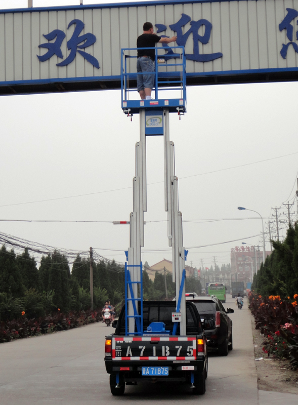 汽車(chē)升降機(jī)根據(jù)舉升機(jī)構(gòu)的可分為剪叉式汽車(chē)升降機(jī)、鋁合金汽車(chē)升降機(jī)、曲臂式汽車(chē)升降機(jī)。剪叉式汽車(chē)升降機(jī)是集四輪移動(dòng)與二輪牽引式于一身,采用汽車(chē)底盤(pán)做平臺(tái)底架,利用汽車(chē)發(fā)動(dòng)做動(dòng)力,既可行駛又可驅(qū)動(dòng)升降機(jī)。剪叉式汽車(chē)升降機(jī)以小型貨車(chē)(汽車(chē))或電瓶車(chē)為載體,移動(dòng)靈活迅速,操作簡(jiǎn)單,作業(yè)范圍廣。車(chē)載剪叉式升降機(jī)采用剪式升降結(jié)構(gòu),剪叉結(jié)構(gòu)采用優(yōu)質(zhì)矩形錳鋼管制作,整體強(qiáng)度高,載重量大,升降穩(wěn)定性好,廣泛用于城建、油田、交通、市政、室外廣告等行業(yè)。